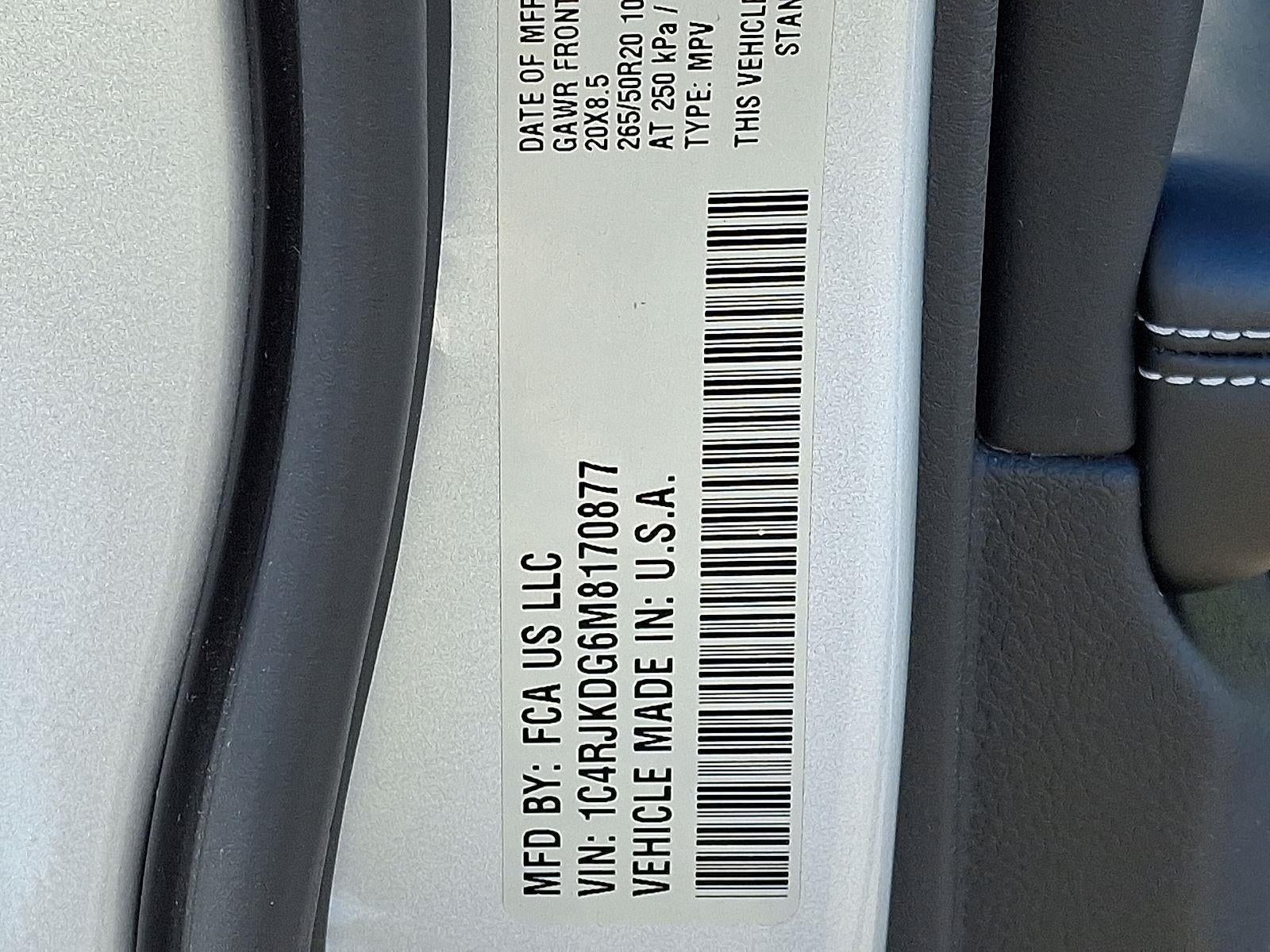 ENGINE: 3.6L V6 24V VVT UPG I W/ESS, TRANSMISSION: 8-SPEED AUTOMATIC (850RE), QUICK ORDER PACKAGE 22N, WHEELS: 20"" X 8.5"" MACHINED FACE ALUMINUM, TIRES: 265/50R20 BSW A/S LRR, MONOTONE PAINT APPLICATION, SILVER ZYNITH, GLOBAL BLACK, NAPPA LEATHER SEATS, GVWR: 6,700 LBS, FRONT LICENSE PLATE BRACKET, RADIO: UCONNECT 5 NAV W/10.1"" DISPLAY, 2ND ROW 60/40 BENCH W/MANUAL TIP/SLIDE