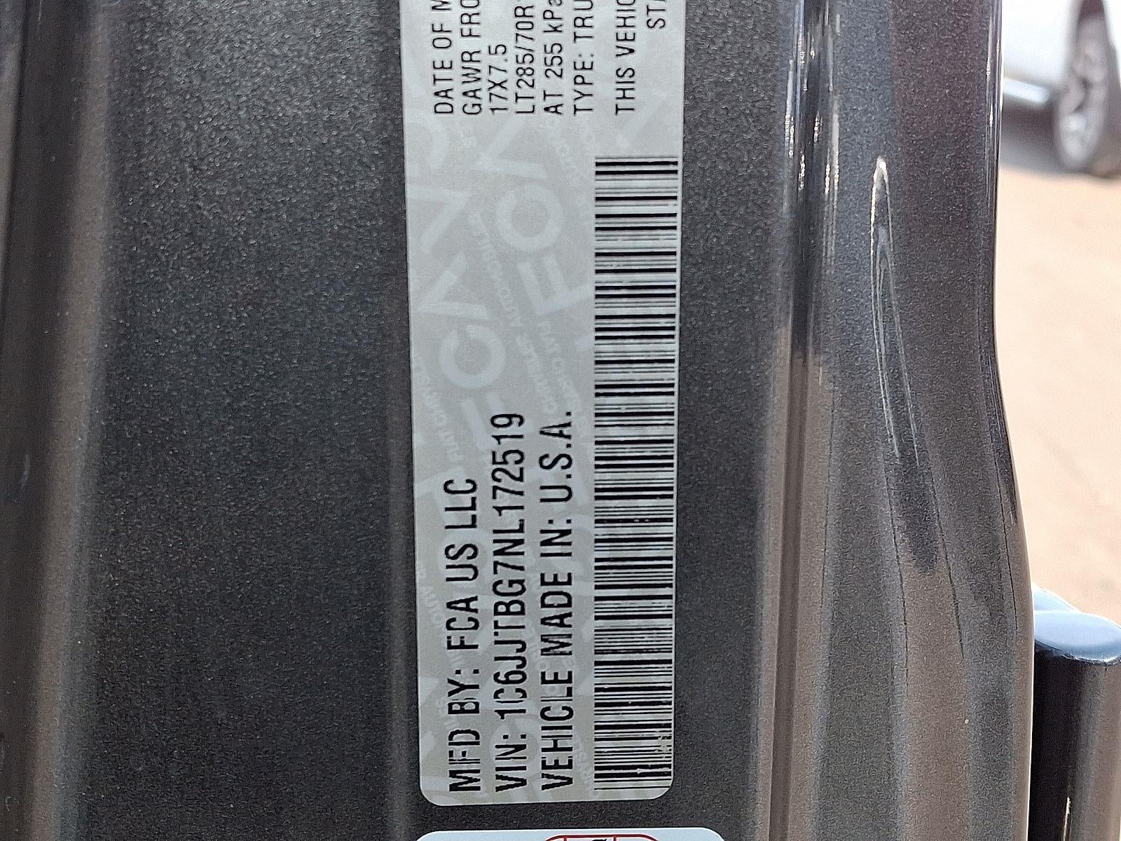 ENGINE: 3.6L V6 24V VVT UPG I W/ESS, TRANSMISSION: 8-SPEED AUTOMATIC (850RE), QUICK ORDER PACKAGE 24R, 4.10 REAR AXLE RATIO, WHEELS: 17"" X 7.5"" POLISHED BLACK ALUMINUM, TIRES: LT285/70R17C BSW M/T, BLACK, LEATHER TRIMMED BUCKET SEATS, LED LIGHTING GROUP, COLD WEATHER GROUP, TRAILER TOW PACKAGE, BLACK 3-PIECE HARD TOP, BODY COLOR FENDER FLARES (2-PIECE), CORNING GORILLA GLASS, FRONT LICENSE PLATE BRACKET, MOPAR SPRAY IN BEDLINER, REMOTE START SYSTEM